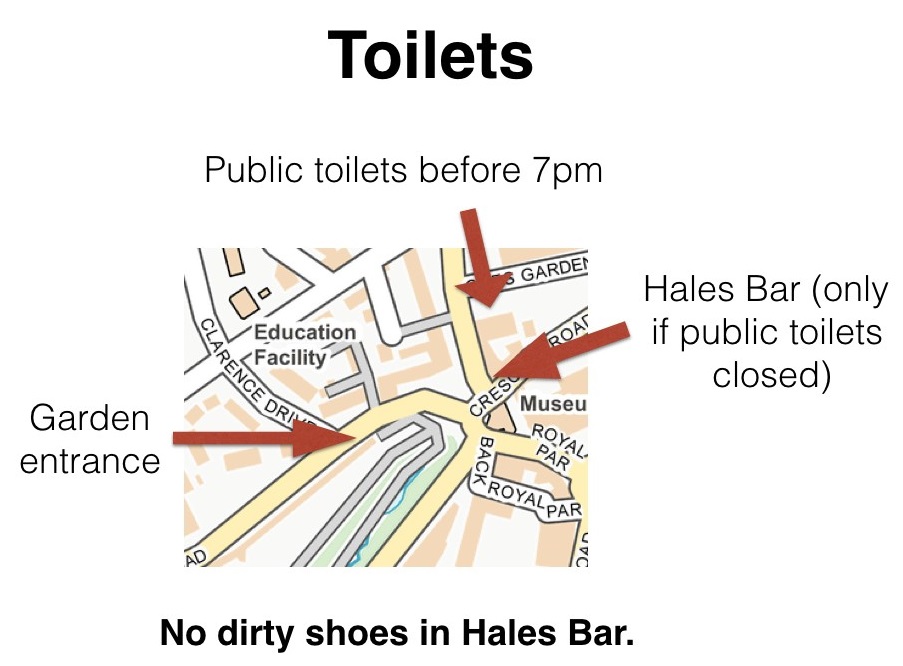 TOILETS AND POST-RUN REFRESHMENT: There are public conveniences nearby in Resent Gardens but these will close some time between 6pm and 7pm. If these are closed we may use the toilets at Hales Bar but the pub is likely to be busy please try to ‘go before you come’ or get to the public conveniences earlier. The Hales Bar is also the perfect venue for post-run refreshment!